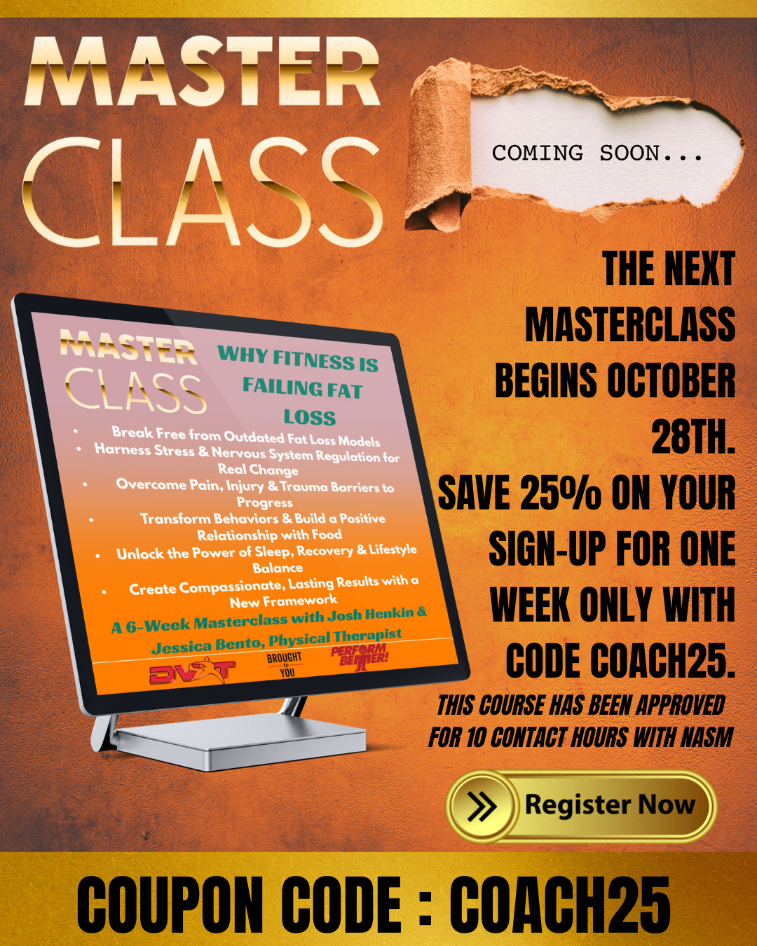 Please note that this course begins on October 28th and runs for six weeks. Live sessions will be held every Tuesday at 2 PM EST and will last for one hour, followed by a Q&A session lasting approximately 20 to 30 minutes. While we encourage live participation, attending the live sessions is not mandatory. Zoom links for each session will be sent out every Monday. Recordings will be provided within 24 to 48 hours after each session, whether or not you attend live. This course is approved by NASM for 10 contact hours, and a certificate will be issued upon completion of the full six weeks.